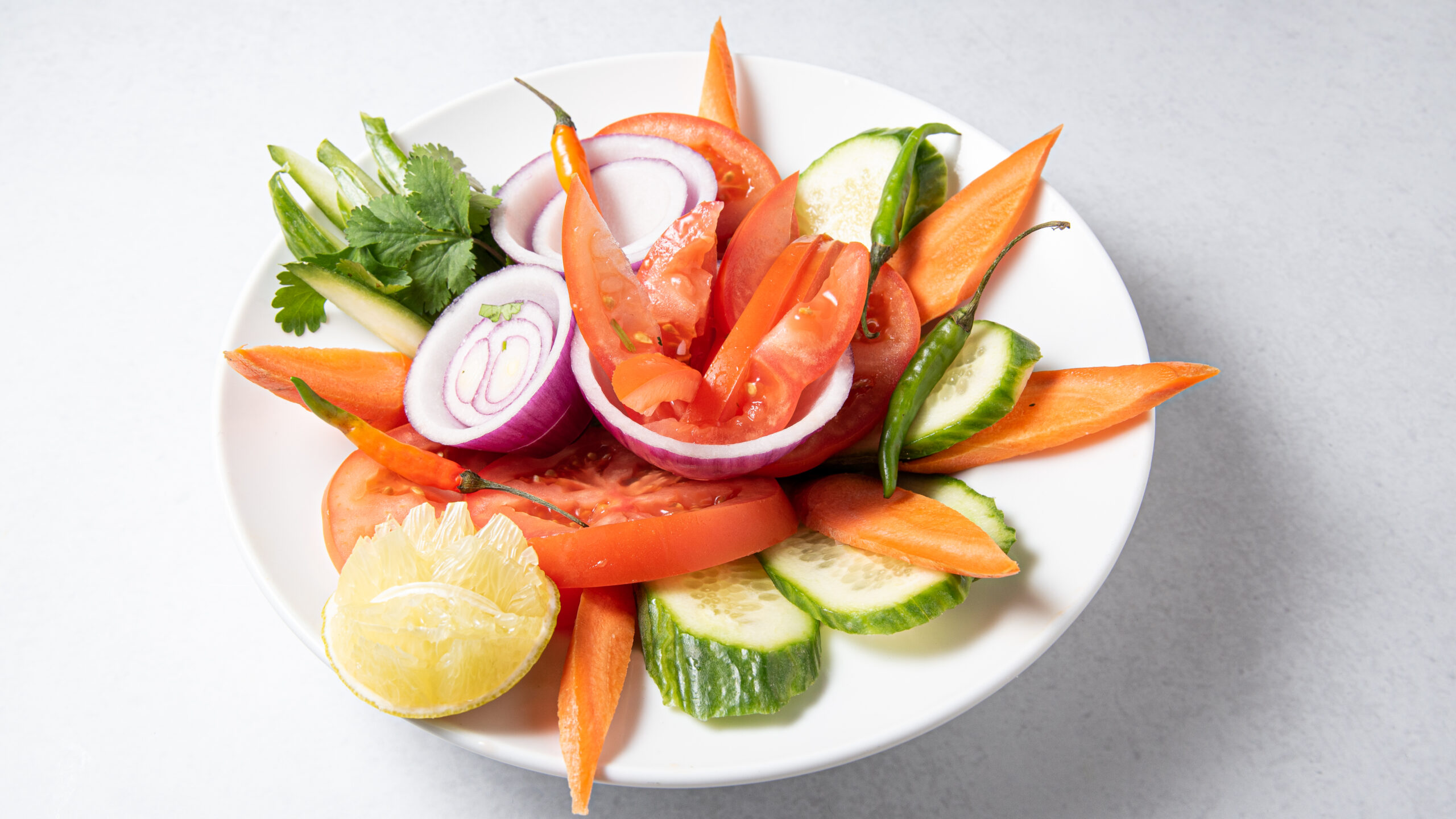 Red onions, carrots, cucumber, tomatoes, lemon, and green chili.