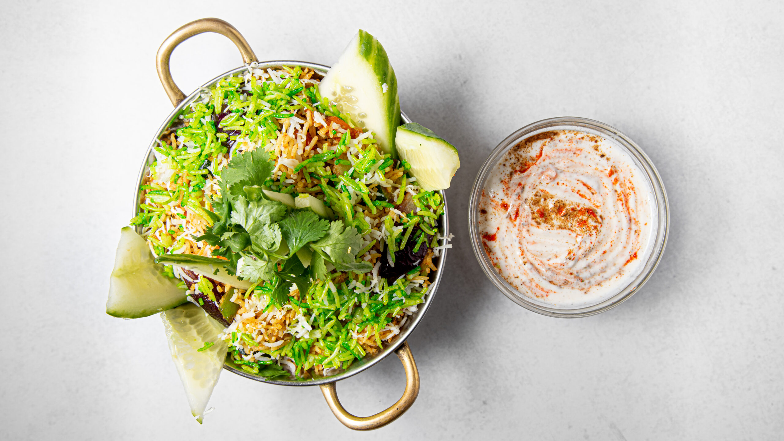 Basmati rice, fried with fresh vegetables, Indian cottage cheese, mint and coriander sauce, nuts, raisins, fine herbs, and spices, served with Raita.