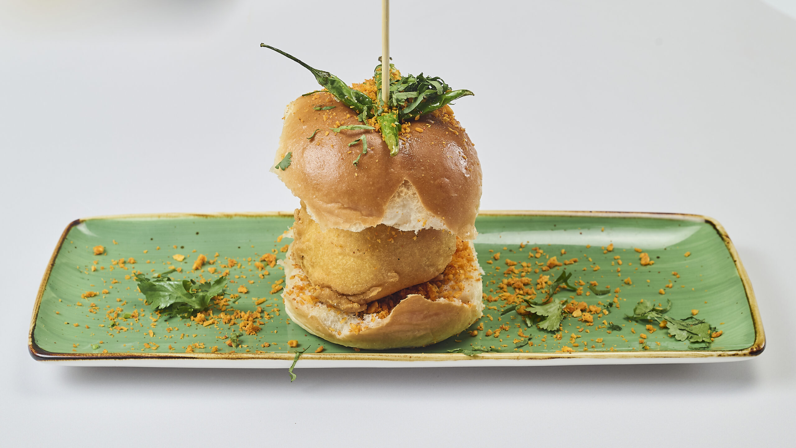 Potato balls coated in gram flour, deep-fried, and served with dry coconut and garlic chutney and Pav.